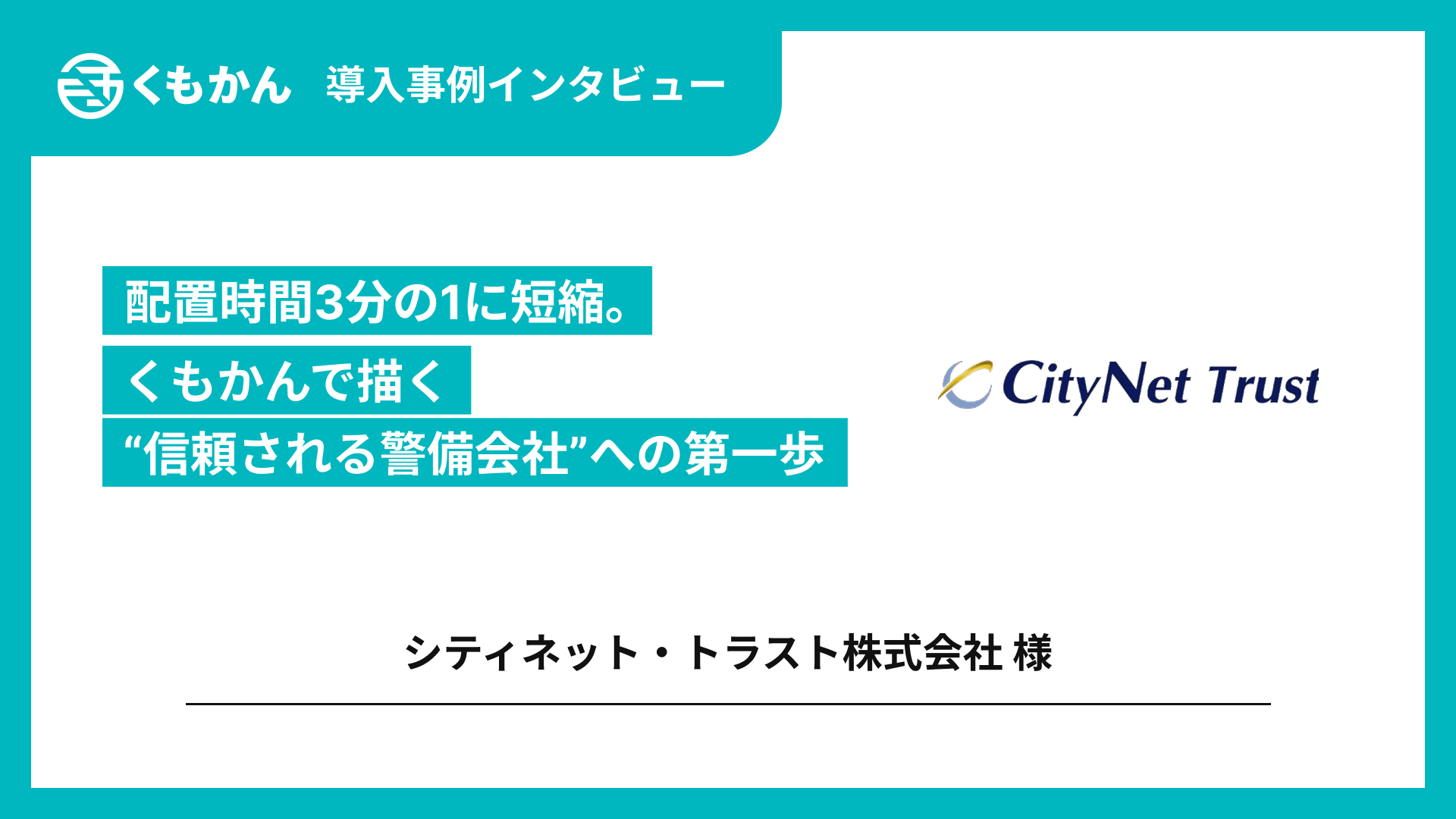 本日は、シティネット・トラスト株式会社の宮本様よりお話しをお聞きしました。 くもかん利用前後の管理体制、警備員さんとのコミュニケーションなど、幅広くお話しをお聞かせいただきました。 警備業を新しくスタートされたタイミングだからこそ、従来のやり方に捉われず様々な方法を模索されているお姿も印象的です。 「うちでも使える?」「まずは話を聞いてみたい」など、少しでもご興味をお持ちいただけましたら、ぜひお気軽にお問い合わせください!