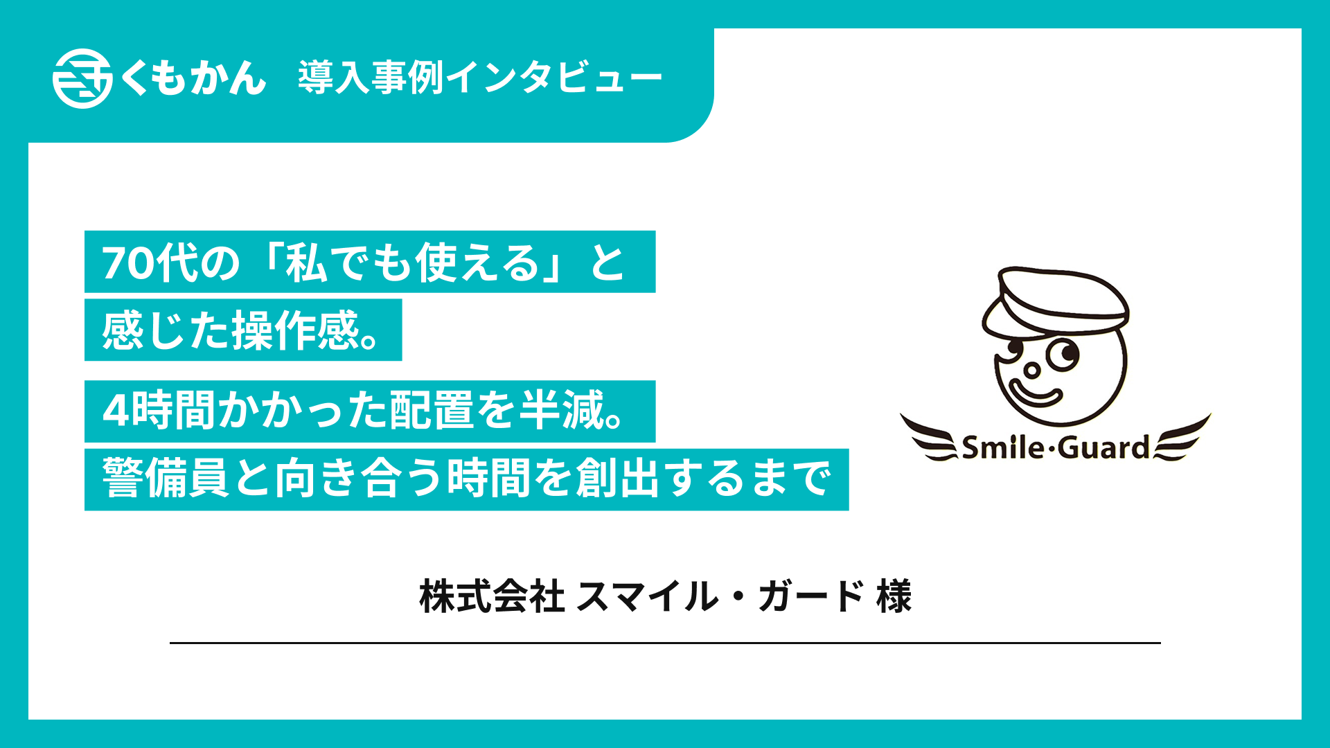 「配置に追われ、警備員と話す時間がない」 そんな課題を抱えていた、熊本県拠点・約80名体制の 株式会社スマイル・ガード様。今回は、その状況がどう変わったのかを伺いました。 配置業務・勤怠管理に多くの時間を要し、管制業務全体が逼迫していた同社が、くもかん導入によってどのような変化を実感されたのか。 内勤の米田様、家村様、橋本様に導入の背景から効果、今後の展望まで現場目線でのリアルな声をお話いただきました。